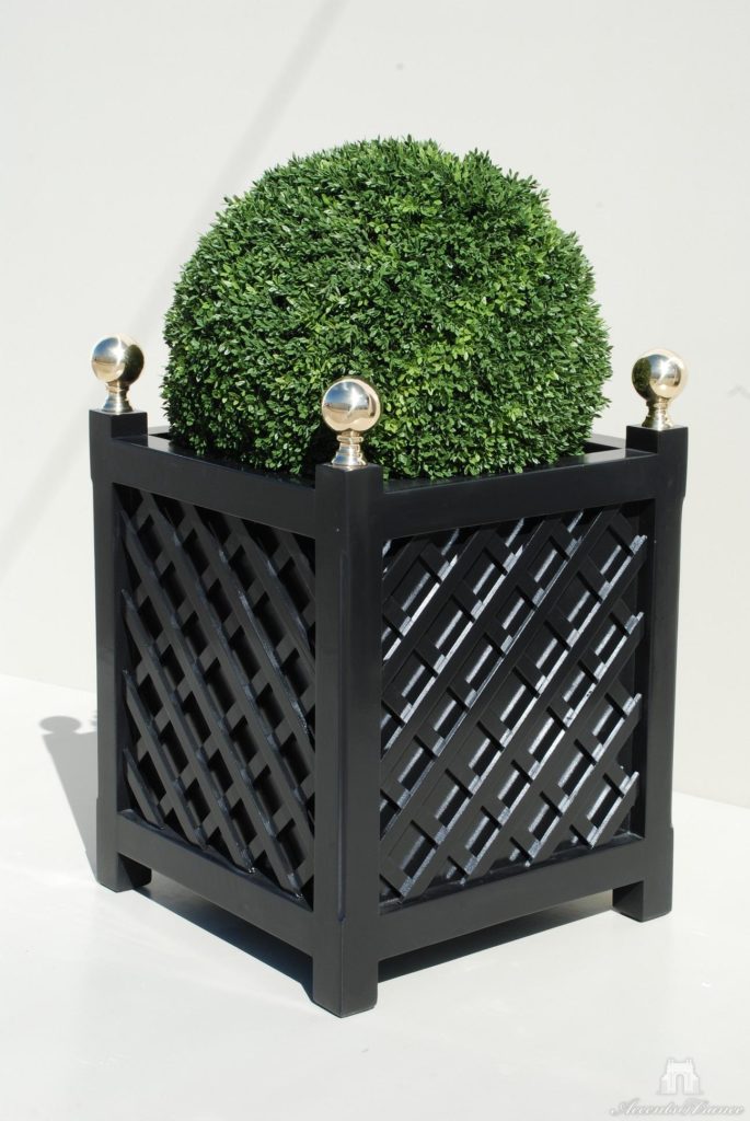 Bac a plante standard avec Treillage, bac de protection en métal et boules en laiton (en option). Montré en 50cm x 50cm avec peinture noire personnalisée. Tailles, couleurs, matériaux et embouts personnalisés disponibles sur demande.