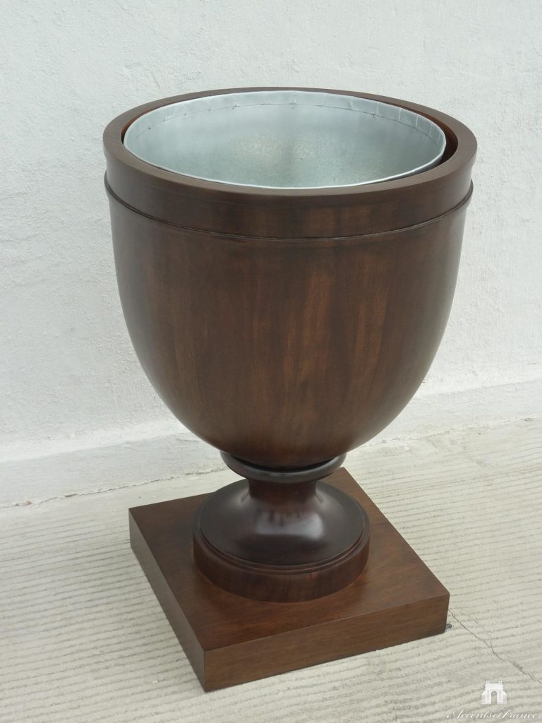 Bac a plante sur mesure de style urne avec socle et doublure métallique. Montré en acajou. Les tailles, couleurs, matériaux et embouts personnalisés sont disponibles sur demande.