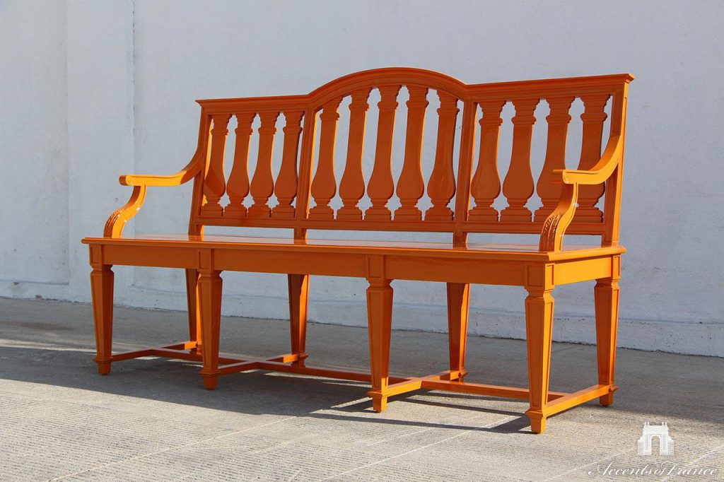 Banc de jardin extérieur en acajou, 3 places, peint de couleur orange sur mesure. Tailles personnalisées, couleurs, matériaux disponibles sur demande.