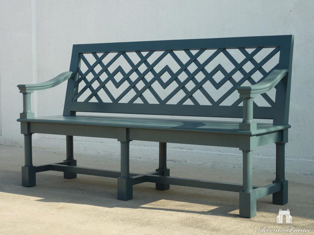 Banc de jardin extérieur ,3 places. Presenté en acajou et peint en couleur personnalisée. Tailles personnalisées, couleurs, matériaux disponibles sur demande.