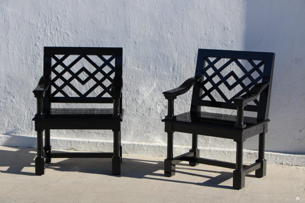 Chaise de jardin d’exterieur en teck avec dossier en treillage. Montré en couleur noire personnalisée avec une finition bateau. Tailles personnalisées, couleurs, matériaux disponibles sur demande.
