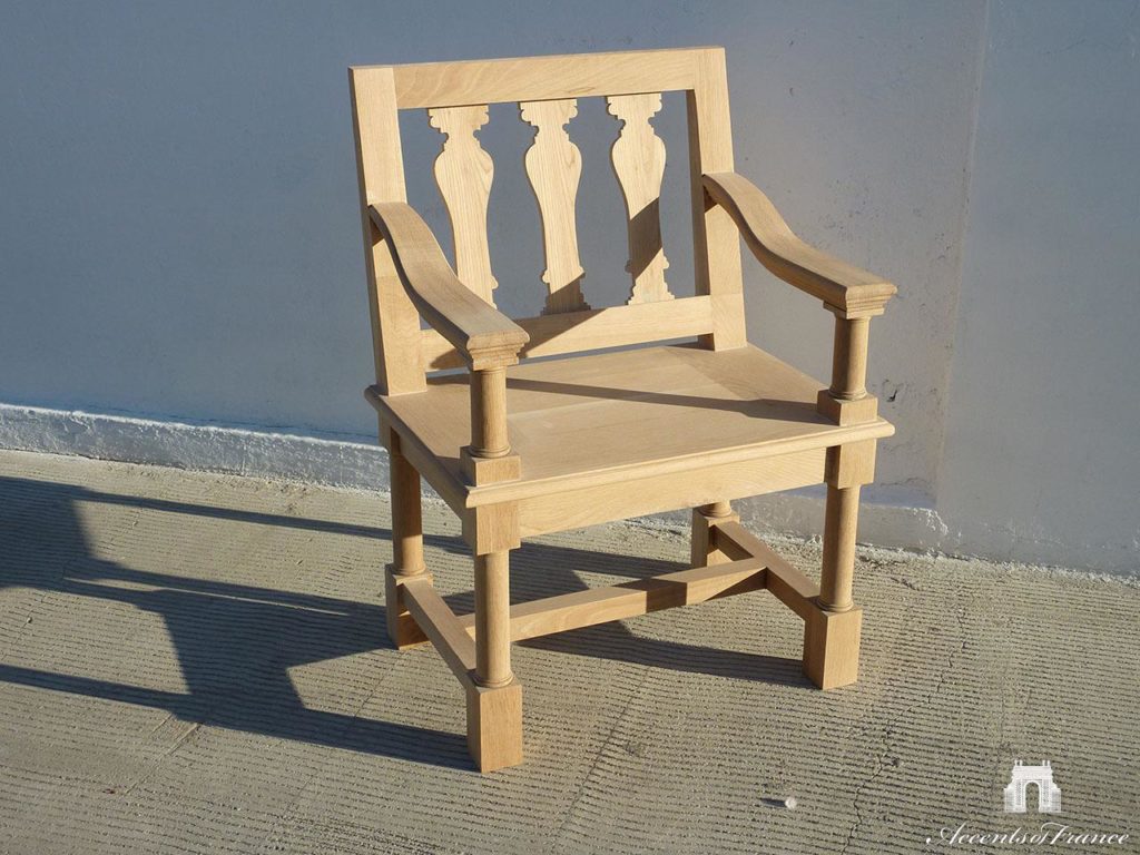 Chaise de jardin avec accoudoirs en teck de finition naturelle. Tailles personnalisées, couleurs, matériaux disponibles sur demande.