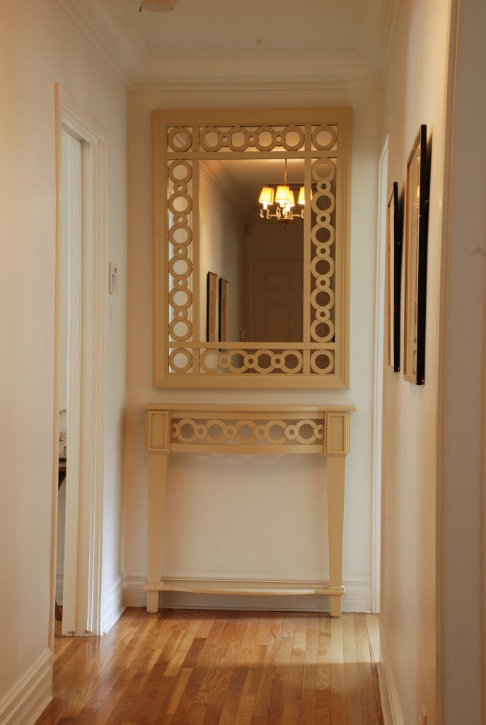 Cadre et console a Ronds standard en bois. Miroir non inclus. Peint en couleur personnalisée. Tailles personnalisées, couleurs, matériaux disponibles sur demande.