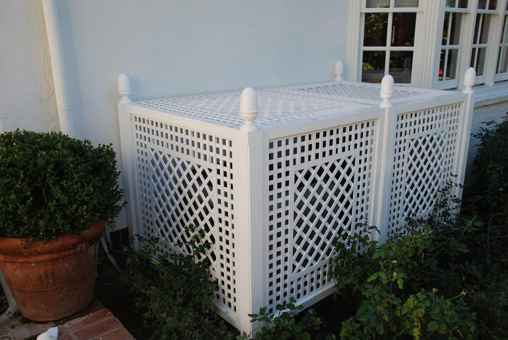 L’appareil de climatisation inesthétique est recouvert de panneaux de treillage décoratif en bois. Peint en couleur blanche standard.