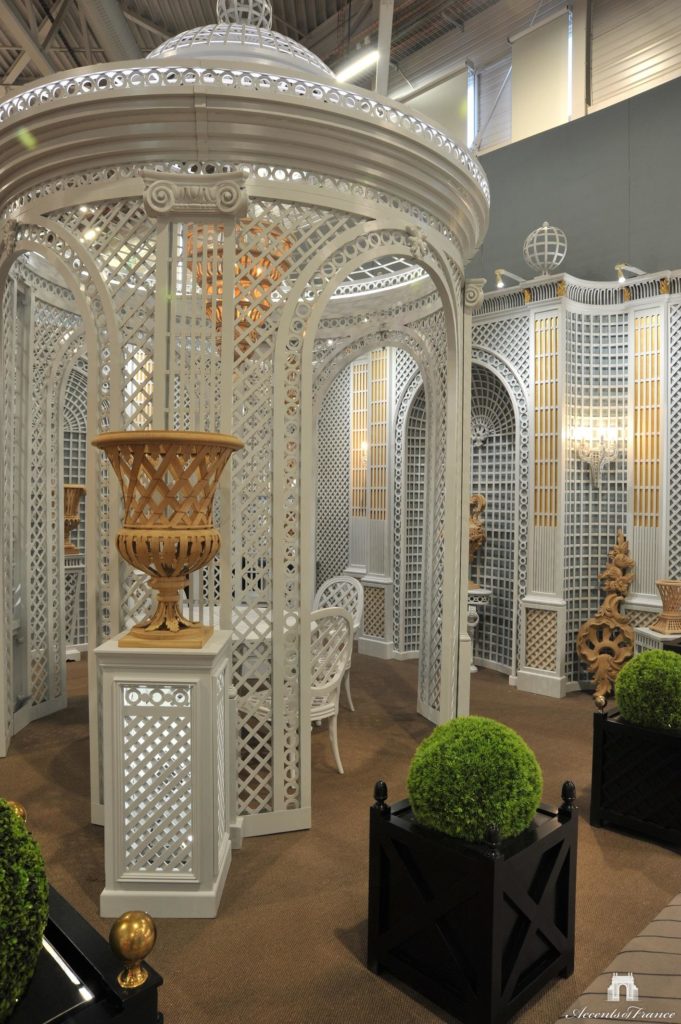 Gloriette en aluminium sur mesure avec arches, frises, peint de couleur blanche standard. Présenté à Maison & Objet Paris avec meubles, jardinières, vases et piedestaux.