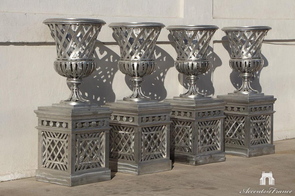 Vase Trianon sur piédestal a Ronds sur mesure en aluminium. Non peint. Tailles personnalisées, couleurs, matériaux disponibles sur demande.