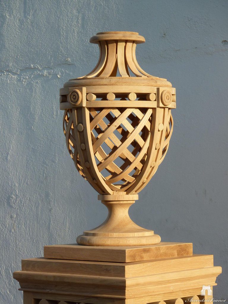 Vase en chêne en finition naturelle avec motif en treillis. Tailles personnalisées, couleurs, matériaux disponibles sur demande.