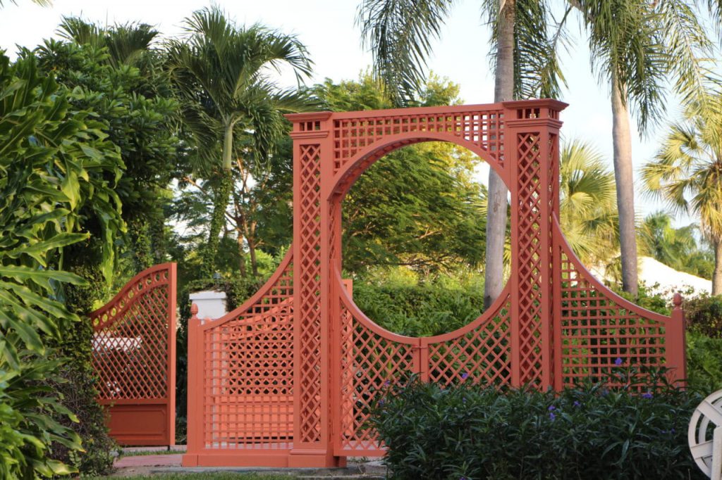 This project in the Caribbeans features a colorful treillage gate which is all in aluminum.