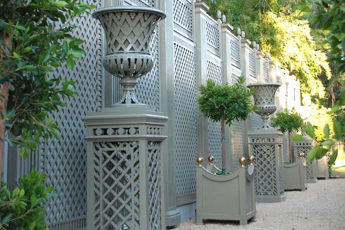 At first, based on a specific drawing, the wall is rebuilt and the treillage against the wall applied. Finally, the outdoor furniture (vases, pedestals and planters) reinforce the instant architecture created by the trellis.