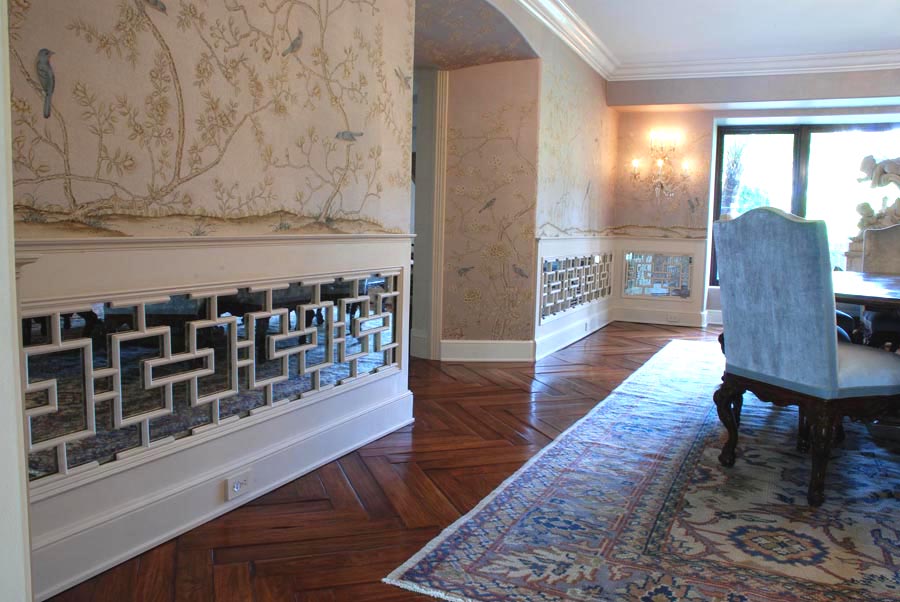 Wainscoting chinoiserie «with antique mirror ». It gives instant architecture to the living room.