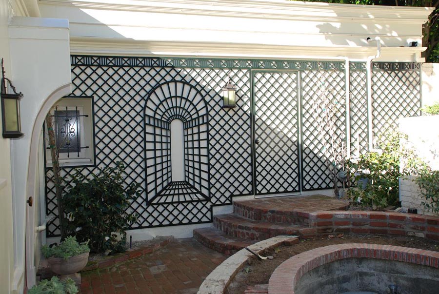 Treillage against the wall in small courtyard.