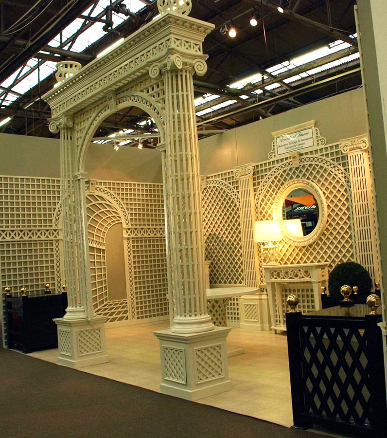 Salon booth. It presents several models of treillage with a selection of furniture pieces.