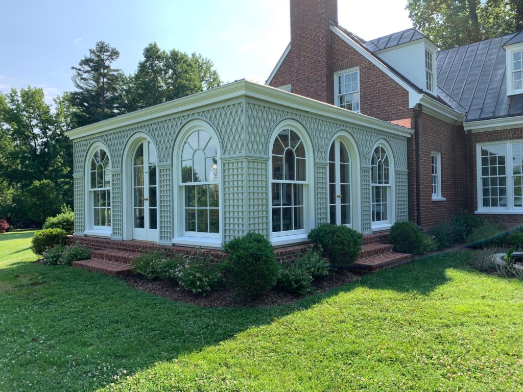 Wood decorative treillage on a facade with moldings and baseboards.