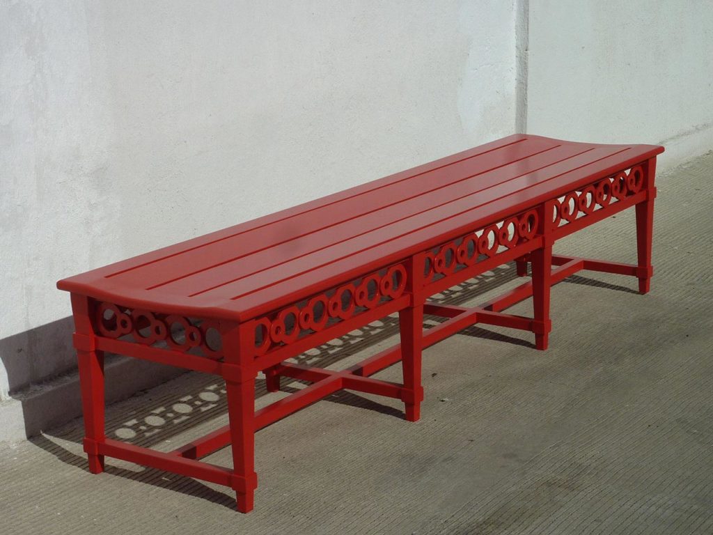 Teak garden bench in custom red color with yacht finish. Custom sizes, colors, materials available upon request.