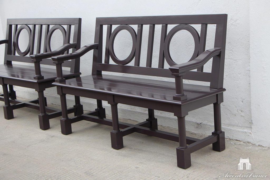 Outdoor garden bench with 2 seats in mahogany painted in custom color. Custom sizes, colors, materials available upon request.