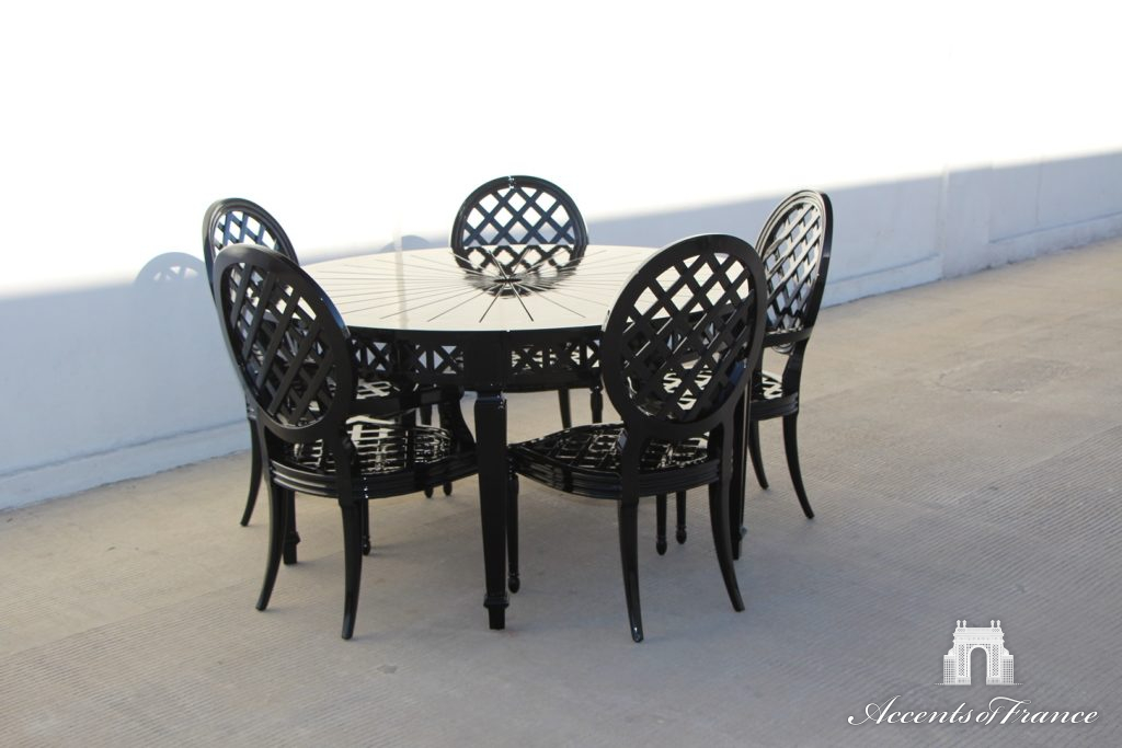 Outdoor Josephine a Croix dining table with chairs painted in custom color. Custom sizes, colors, materials available upon request