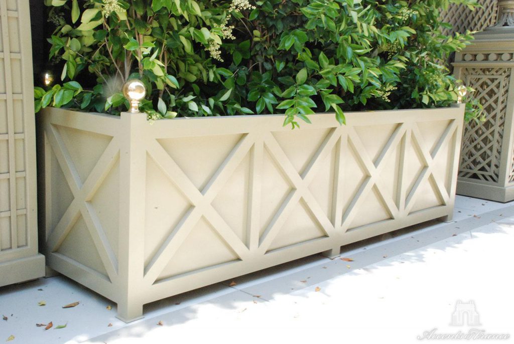 Standard aluminum Cross jardiniere with Brass finial option. Shown in 60″ with custom paint and metal liner. Custom sizes, colors, materials and finials available upon request.