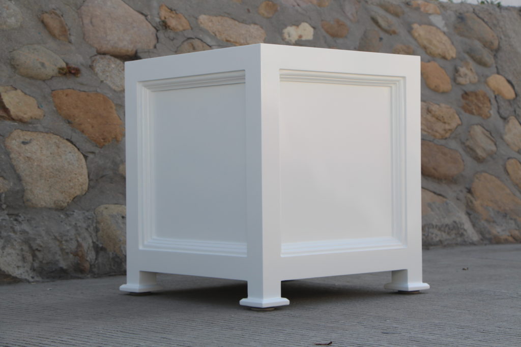 Outdoor square planter. Shown in 20″ with standard white color and metal liner. Custom sizes, colors, materials and finials available upon request.
