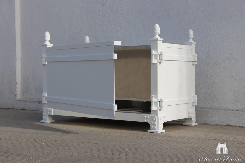 Extra large, Versailles-style outdoor planter with Acorn finial. Removable side panel allows for easy installation or removal of trees. Shown in 39″ with standard White color and metal liner. Custom sizes, colors, materials and finials available upon request.