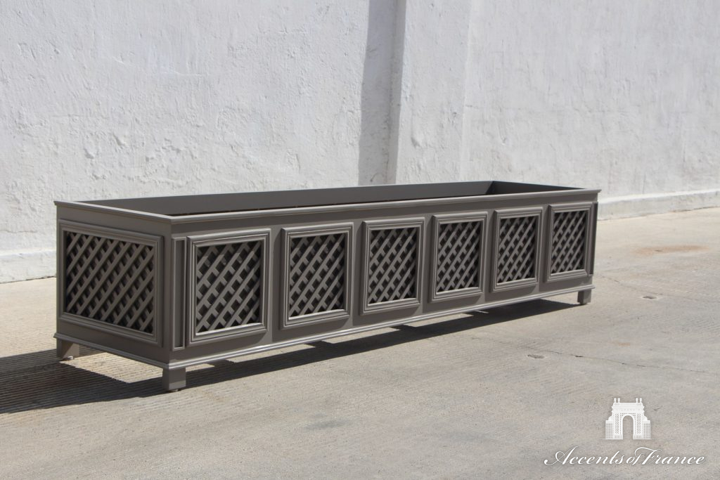 Extra large outdoor trelliswork style planter with metal liner. No finial. Shown in custom paint color. Custom sizes, colors, materials and finials available upon request.