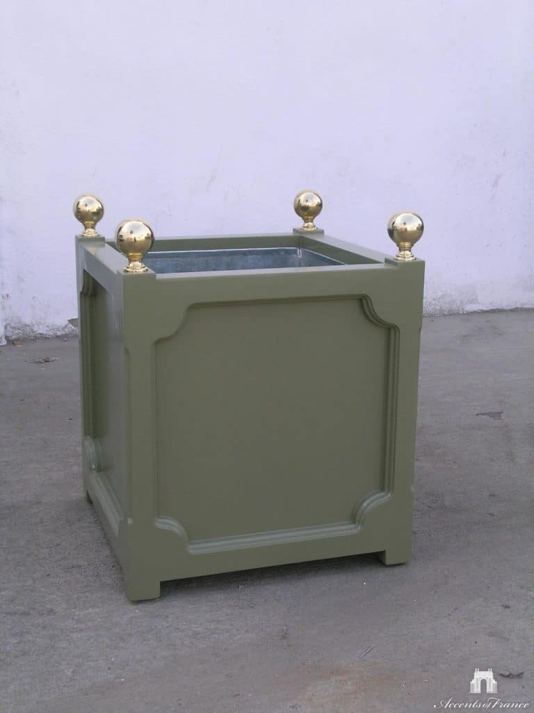 Custom design wood planter box with brass finial and metal liner. Shown in custom color. Custom sizes, colors, materials and finials available upon request.