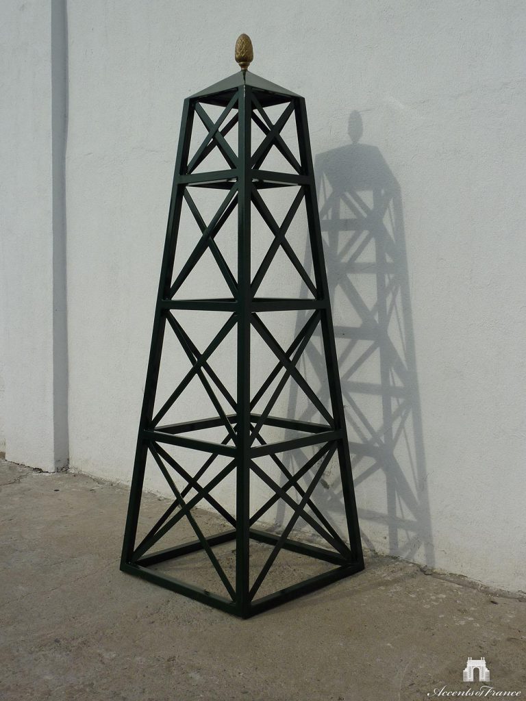 Aluminum garden obelisk with acorn finial in standard Dark Green color. Great for training climbing roses or vegetables. Custom sizes, colors, materials and finials available upon request.
