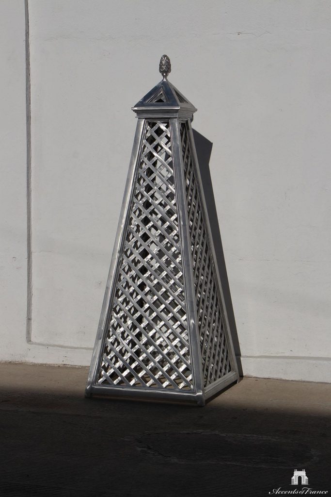 Aluminum garden obelisk with trellis design and acorn finial. Shown unpainted. Custom sizes, colors, materials and finials available upon request.