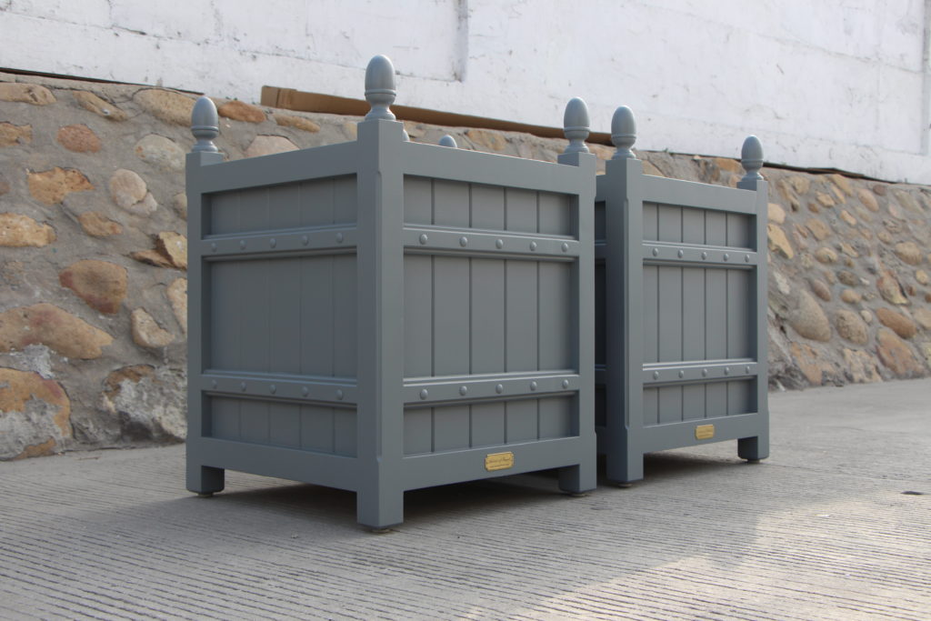 Standard Versailles-style outdoor planter with acorn finials and metal liner. Shown in 20″ with custom Grey color paint. Custom sizes, colors, materials and finials available upon request.