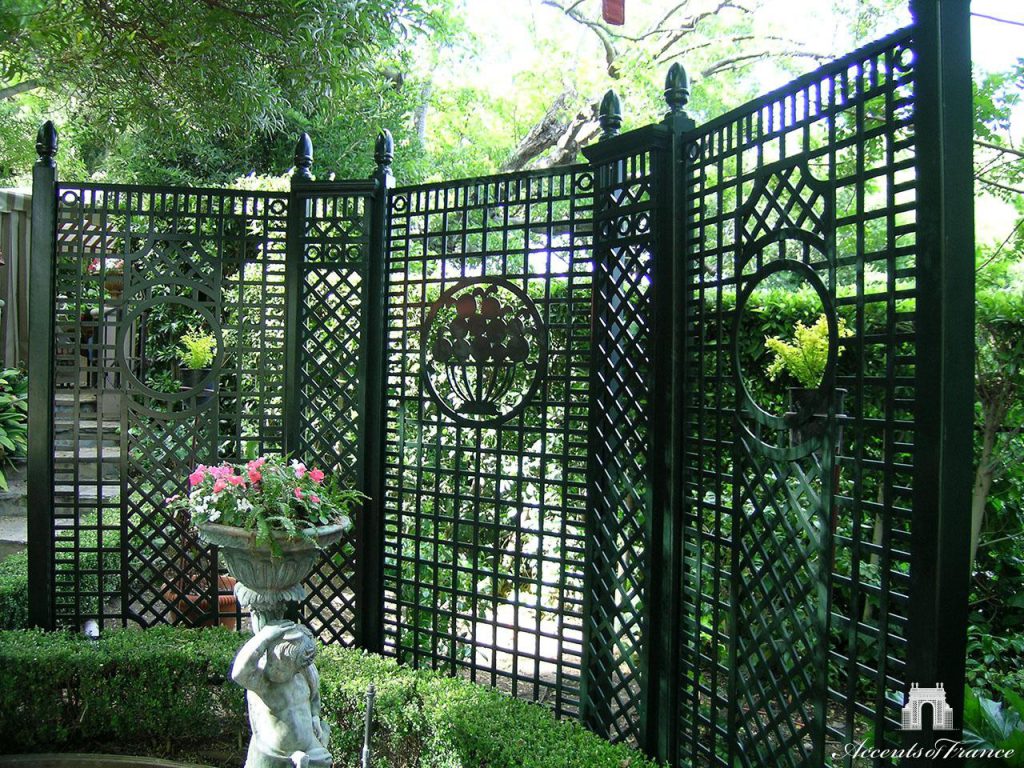 Custom Wood Treillage panels in the Vigny style at a residence in Los Angeles. Painted in standard Dark Green.