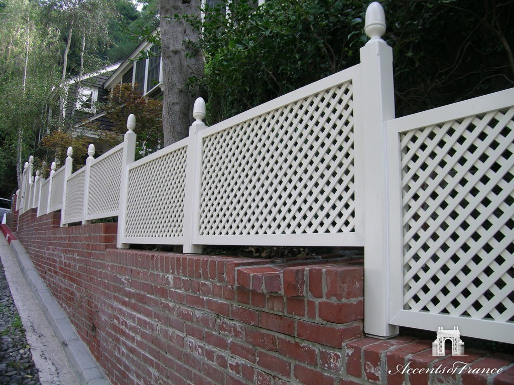 An elegant fence is created with the use of decorative latticework.
