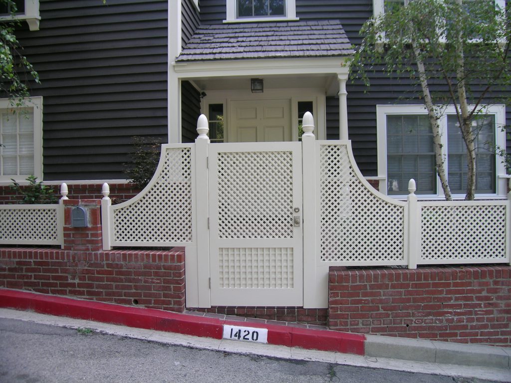 Custom wood entry gate. Treillage cross pattern with posts and acorn finials. Painted in standard white color.