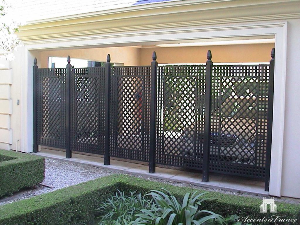 Standard aluminum Musset panels with posts & finials. All painted in custom color. Installed Freestanding. Custom sizes, colors, materials available upon request.