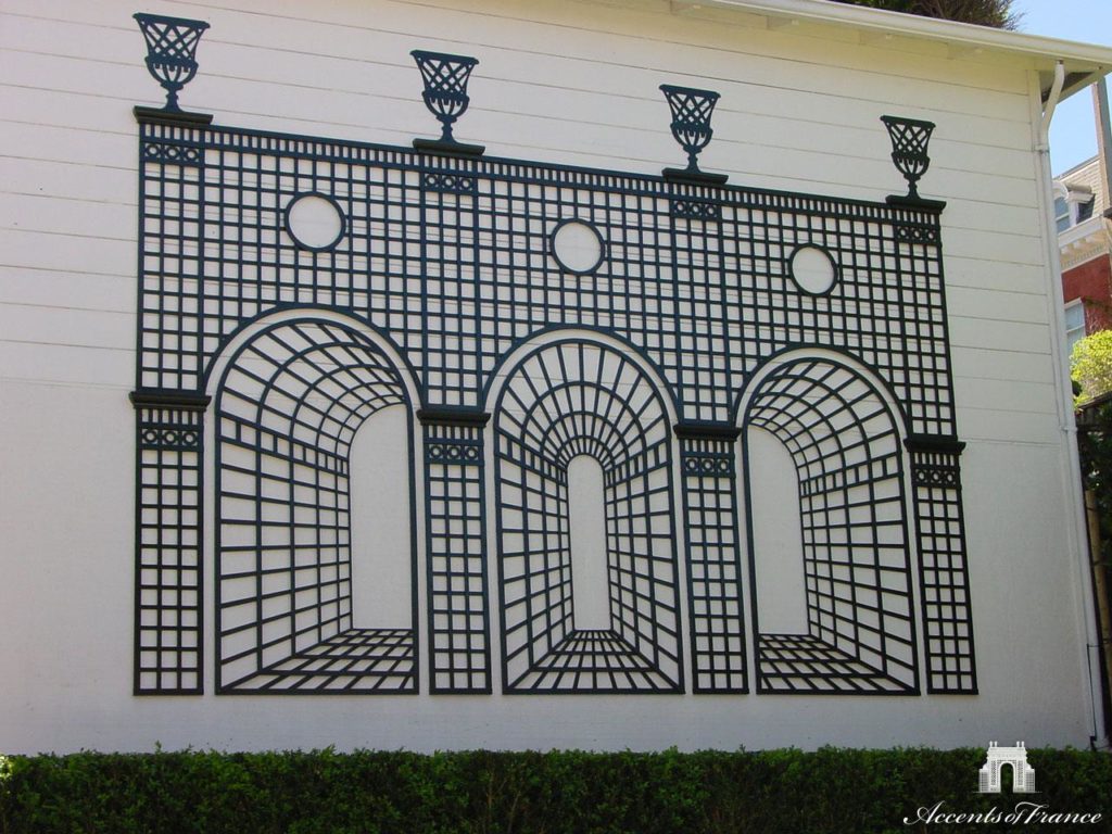 Semi custom set includes: Trompes l’oeil, mini Renards, custom panels and Medicis vases on top painted in custom color. Installed against the wall. Custom sizes, colors, materials available upon request.