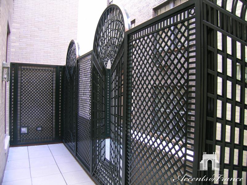 Custom wood treillage on a city balcony with trompe l’oeil. Painted in standard dark green color.