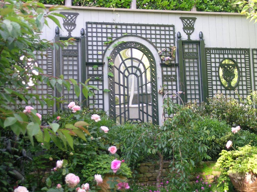Ce treillage accompagné de miroirs créent un point focal dans le jardin. Le treillage vert foncé contre le mur s’intègre parfaitement dans l’environnement naturel (plantes et fleurs).